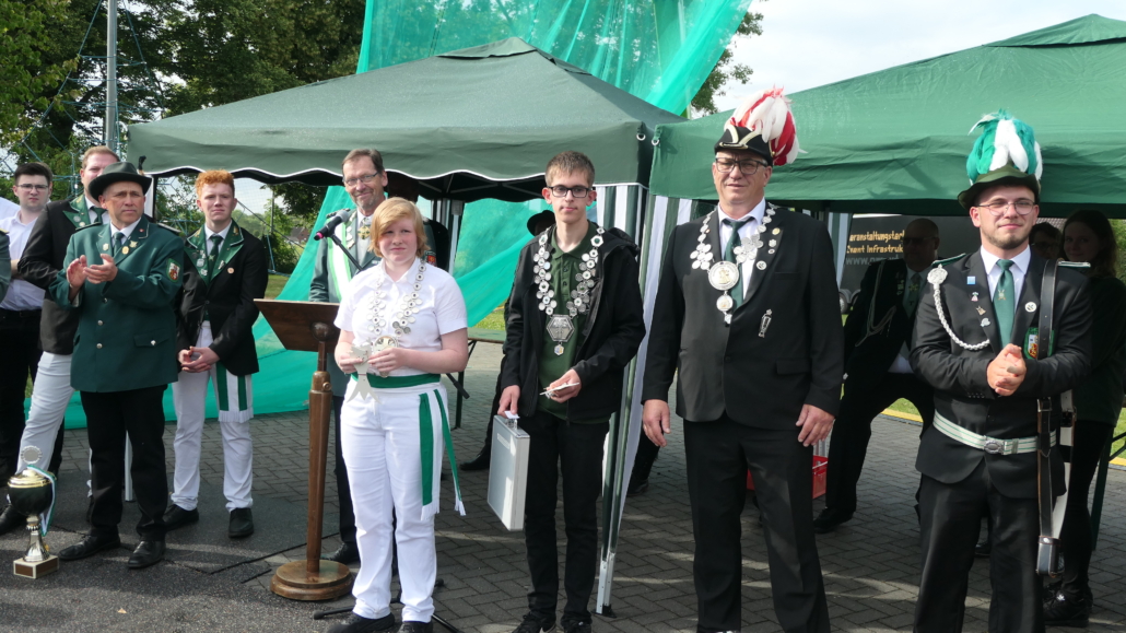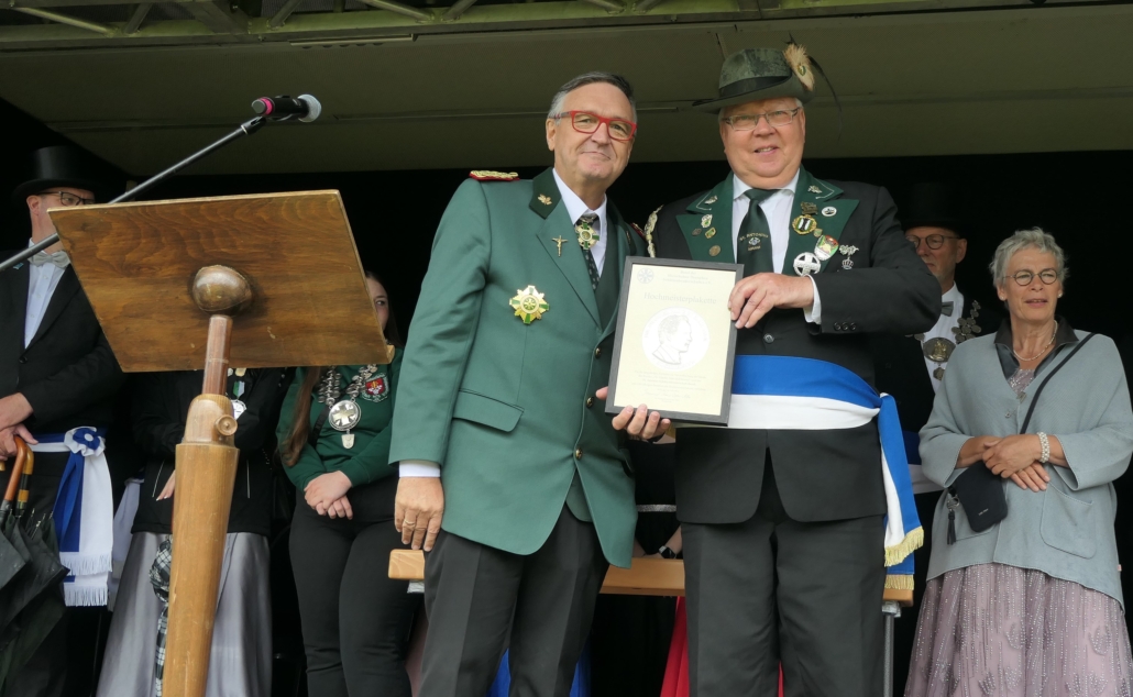 Nach der leider verregneten Messe auf der Festwiese machte sich der lange Tross auf den verkürzten Weg durch unser schönes Dorf zurück zum Ausgangspunkt. Vor über 300 Menschen begrüßte der stellvertretende Bundesschützenmeister Wolfgang Genenger die Anwesenden in der großen Runde und überreichte unserer Bruderschaft anlässlich des 100jährigen Jubiläums die Hochmeister Plakette (Foto). Der Bezirksbundesmeister, Hans-Gerd Frerix, unser Brudermeister Gabriel Neul, und die Sonsbecker Bürgermeisterin, Nadine Bogedain, hielten die Festreden. Pünktlich um 14 Uhr begann das Schießen mit der Armbrust auf den hölzernen Vogel, das Schießen der Jugend und Schüler mit dem Luftgewehr und der Wettbewerb der Damen mit dem Lasergewehr. Trotz einiger Regenschauer machten es sich alle Besucher bequem unter den vielen Pavillons und feierten die Gemeinschaft. Am spannendsten war natürlich das Geschehen an der Armbrust, wo 3 Königinnen und 12 Könige um den Sieg rangen. Mit dem 161. Schuss holte Wilfried Rogge, amtierender König der St. Petrus Schützenbruderschaft Wetten den Kopf des Vogels herunter und ist jetzt für ein Jahr Schützenkönig des Bezirks Kevelaer.